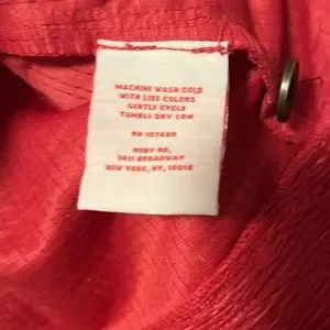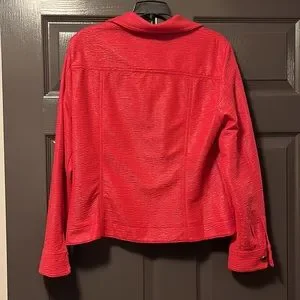 Red button up top. Can be worn as a jacket or shirt. Great condition. Comfortable. In sunlight, this is a bit of a pinkish red. The first photos are at night. Photos with measurements are in sunlight.