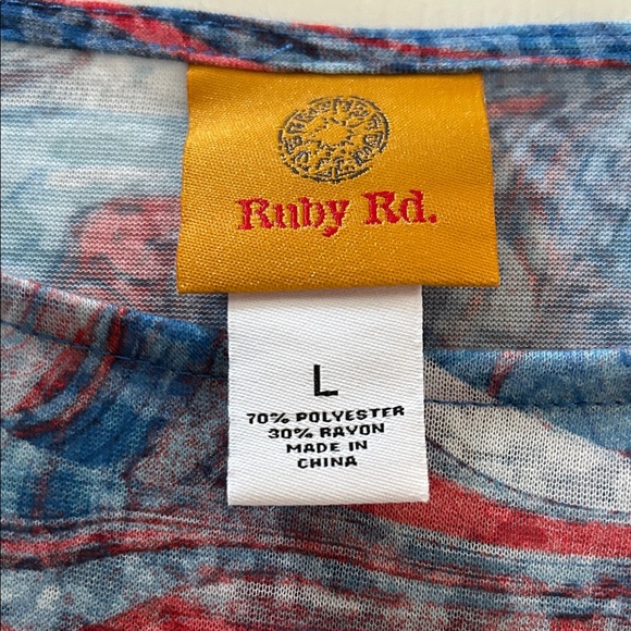 Stylish short sleeve tee by Ruby Rd. Features a blend of red, white and blue colors. Comfortable polyester-rayon fabric. NWOT