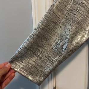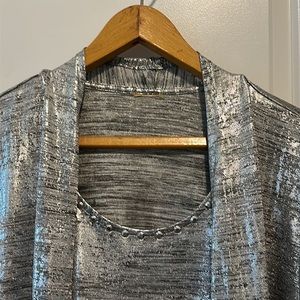 Shimmering silver blouse. Open front design. Long sleeves. Perfect for evening wear.