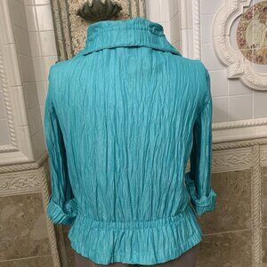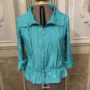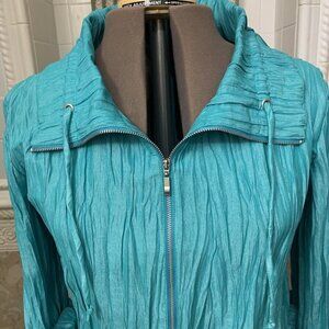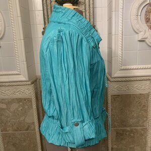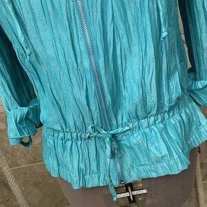 Ruby Rd. Size 14. Crinkle Cotton Blend Long Roll Tab Sleeve Jacket. Center back 22". Sleeve 23" w/ Snap. Bust 22/44". (Armpit to armpit X2 - Taken with tailor's tape so could have a bit of play. Please add your preferred amount of ease.) Indonesia. Machine wash. Shoulder to hem 22.5". Zip closure. 2 drawstrings. More toward the greenish than the blue in pics. Very good pre-loved condition. No damage that I can see.