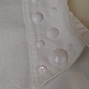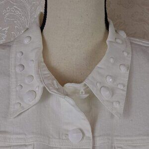 This white denim jacket has a bit of stretch to it for comfort. The buttons and decoration on the collar and pockets are a white faceted plastic. Two slip pockets on the front. Chest pockets are faux. 3/4 sleeves with buttons at the cuffs. A perfect neutral.
