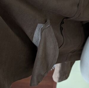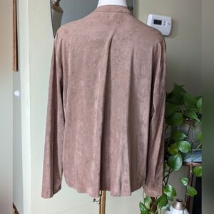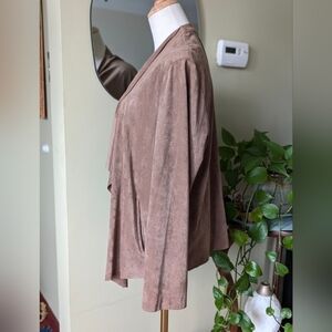 This Ruby Rd. shacket is in excellent used condition (EUC). It features a warm taupe color (a mix of brown and gray) with a stylish open, waterfall/drape front. Made from faux suede leather material, it offers a luxurious look and feel. Crafted from a polyester and spandex blend, it has a bit of stretch for comfort. The two slip pockets in the front add practicality to this beautiful piece.