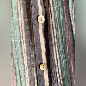 Ruby Rd. Stripe button down with abalone style buttons. Buttons on sleeves with inside tabs to hold rolled up sleeve.