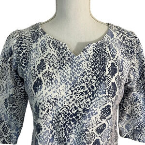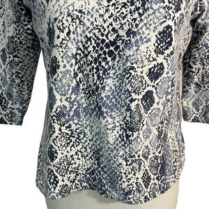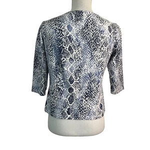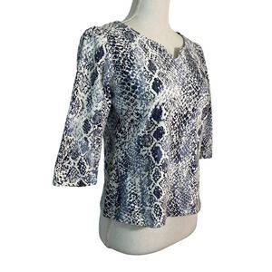 Ruby Rd Snakeskin Top Blue White Petite Medium V Neck 3/4 Sleeve Fitted Stretch