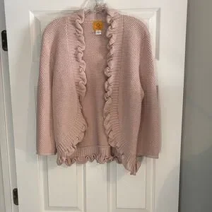 Chic and cozy cardigan with ruffle trim. Ideal for layering. Soft pink hue adds elegance.