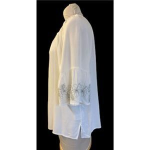 Super feminine top by Ruby Rd. Size Petite XL. Square neck and embroidery on sleeves. Flowy, breezy, lightweight and packable.