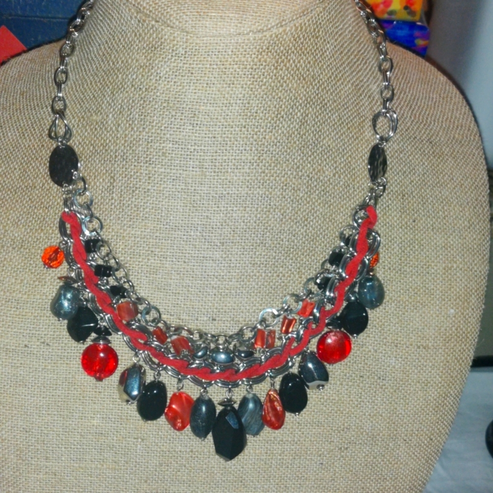 Gorgeous necklace can show off any outfit you would decide. Very colorful with fall colors like burnt orange and a maroon colored red with gray and black. 11" long it falls just slightly above breasts. new never used