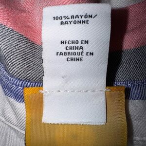 Stylish striped button-up shirt with front pockets and roll up sleeves. Features pink, blue, and white stripes. Flowy