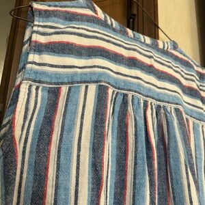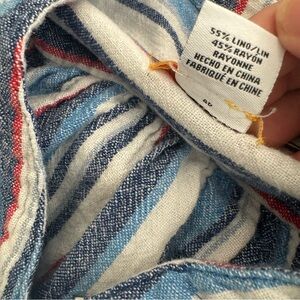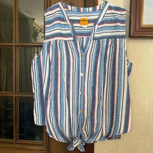 Striped red, white & blue sleeveless top, with shell like buttons & tie knot at the bottom. Enjoy the comfort and chic design that makes it a must-have addition to your collection!