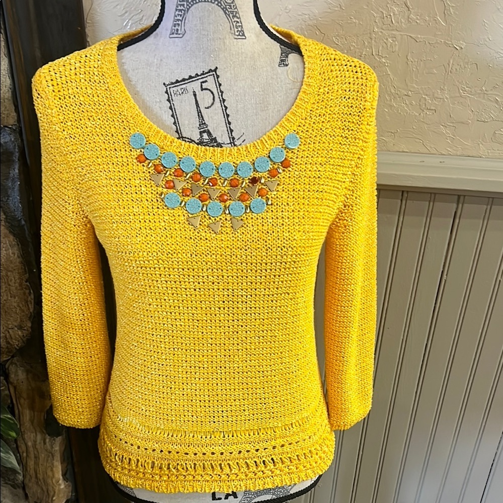 Ruby Rd. Sweater Gold Weave Embellished 3/5 Sleeve Stretch Adorable!! Approx Armpit to armpit 17.5” Length 21”