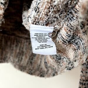 This item is in excellent condition with no flaws found. It is pullover style with scoop neck. It has drop shoulder style long flared sleeves. It's made of variegated. yarn in ivory, brown and black. 90% cotton, 10% nylon, lightweight and stretchy. Textured, almost boucle knit.
