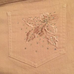 Ruby Rd. brand tan crop pants with tonal embroidery & rhinestone design on back pockets. Floral embroidered design with a smattering of rhinestones makes these perfect for day or evening wear. In perfect condition, washed but never worn. Cotton polyester spandex blend makes them so comfortable.