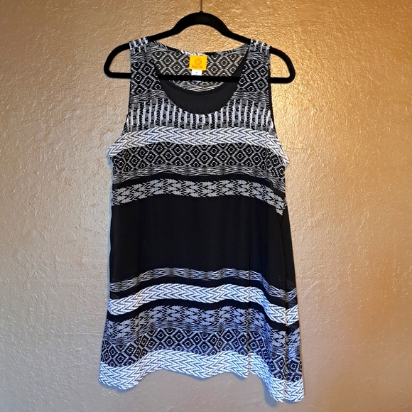 Tank Top in black and white. There is a stretchy solid black under tank with a black and white sheer not stretchy patterned tank over it. Size medium. Under tank measures 18 inches pit to pit with the outer sheer tank measuring 20 inches pit to pit. Length of sheer tank is 29 inches long, measured down the back. Nice used condition.