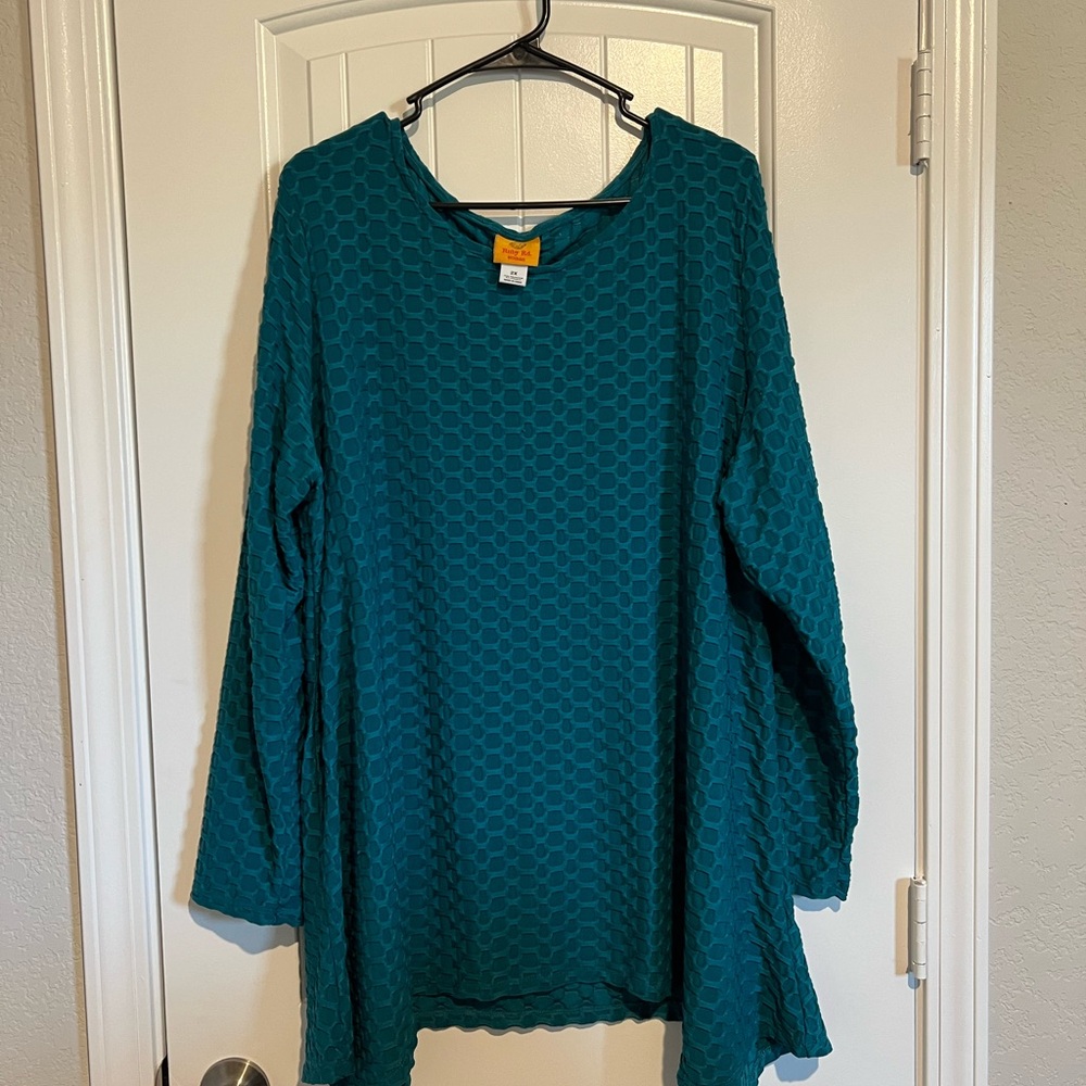 Chic teal tunic with textured pattern. Long sleeves for versatile styling. Ideal for casual or dressy looks.