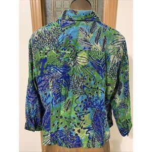 Jacket, top, blue, green, teal, turquoise, cobalt, lime, botanical, leaves, foliage, nature print, textured, woven, structured, collared, zip-up, full zip, 3/4 sleeve, lightweight, casual, bohemian, tropical, resort wear, statement, art to wear, artistic