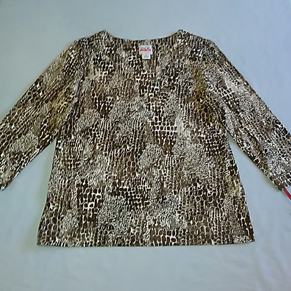 This new with tags Top by Ruby Road favorites is a size medium and is made of 95% cotton and 5% spandex. Features an interesting neckline. It measures approximately 24 inches long and 19 in across the chest. The colors are brown and white.