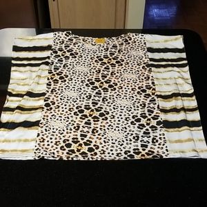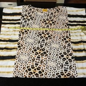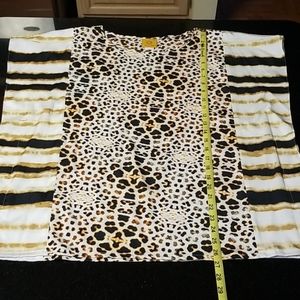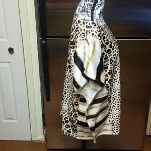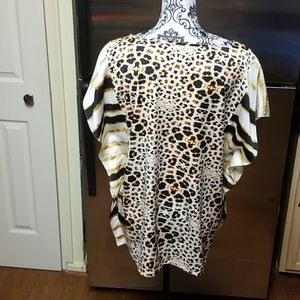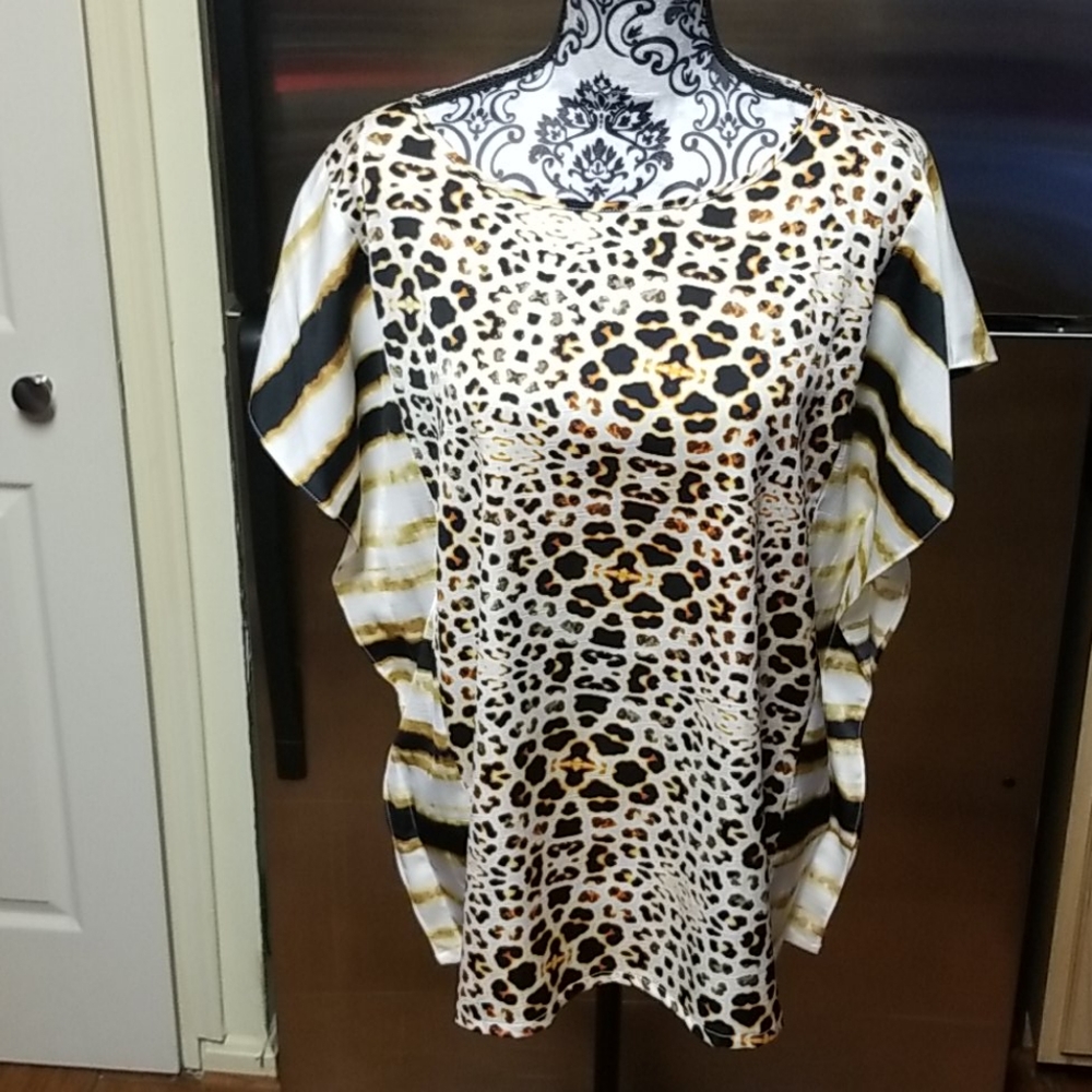 Animal print, flowy sides, poncho-like sleeves, polyester/spandex blend