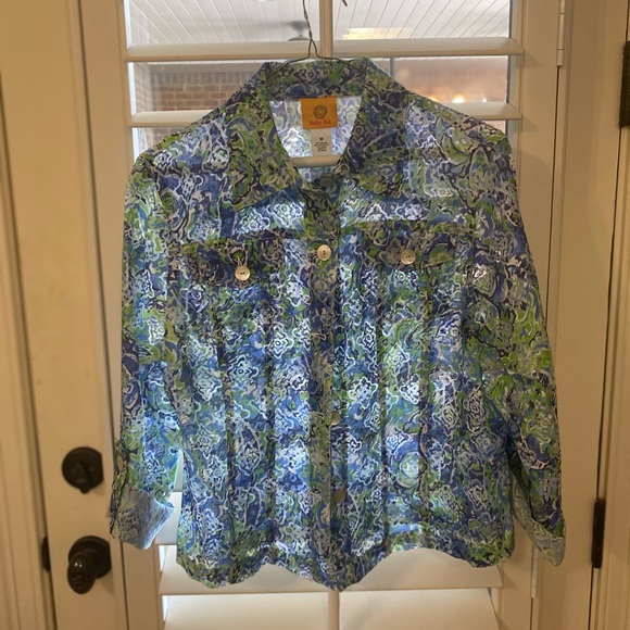 Ruby Rd button down in blue and green floral designs.