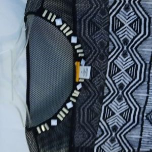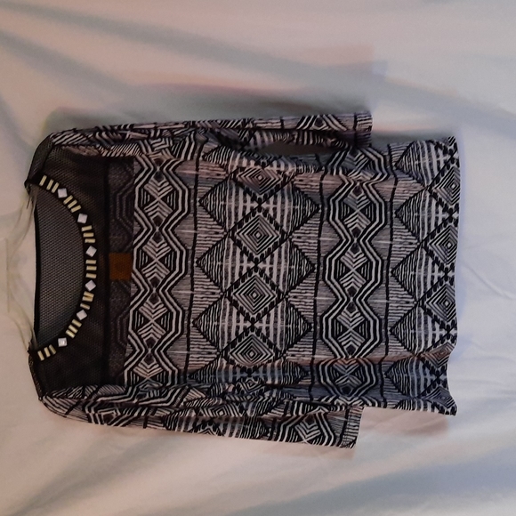 Black and white Ruby Rd. knit top. It has mesh and beading at the top.