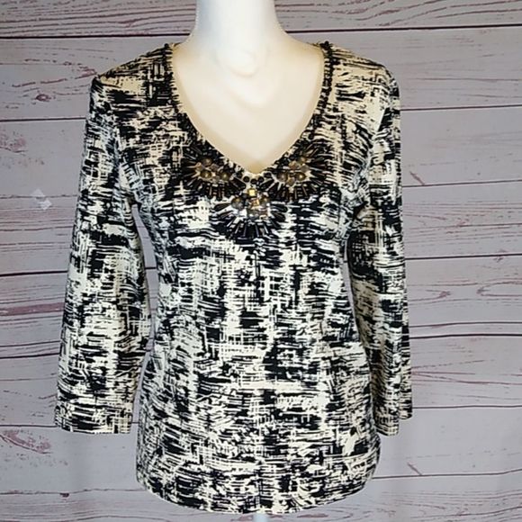 95/5 Cotton/Spandex top in black & ivory. Beadwork around entire v-neck. Length is 23". Pit to pit is 18". Sleeve inseam is 13". Size S.