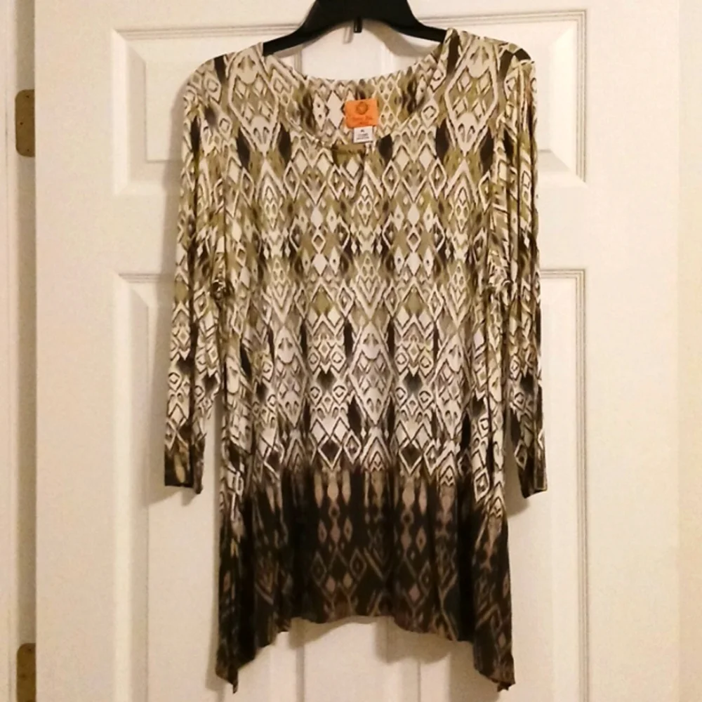 The colors in this top are olive, white, black and taupe. 95% Rayon 5% Spandex 3/4 sleeve length There is a ornamental piece at neckline. 20 1/2" pit to pit
