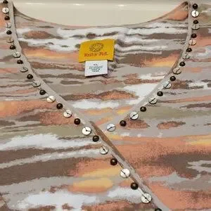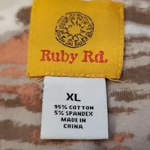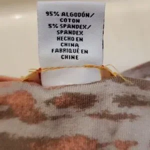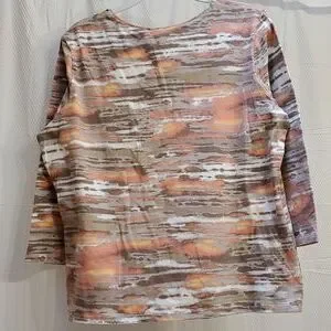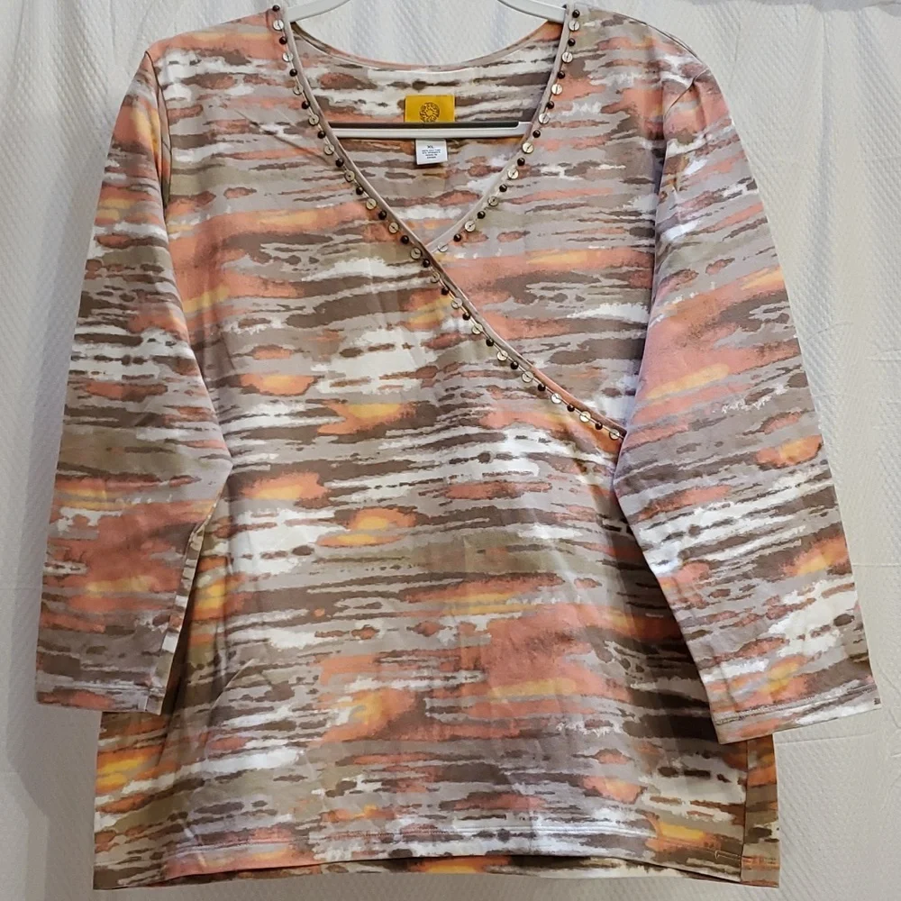Stretchy faux wrap top in pretty shades of mocha and salmon with 3/4-length sleeves. Measures 23" across the chest and 24.5" long.
