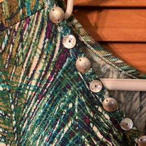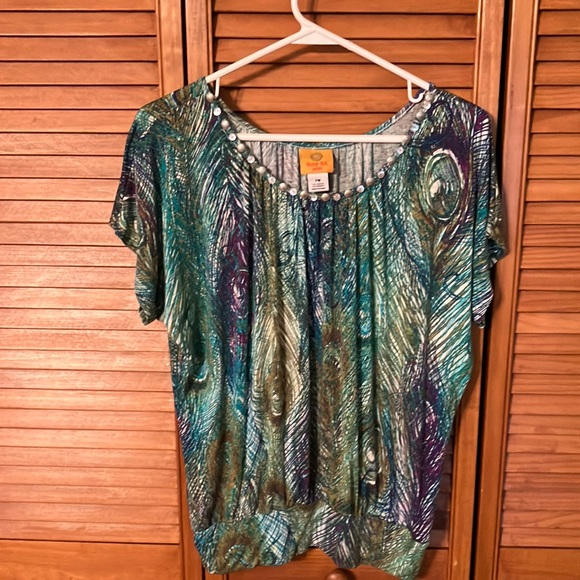 Ruby Rd. Top with buttons around neck and band at waistline; multi colored; excellent condition; never worn; non smoking home