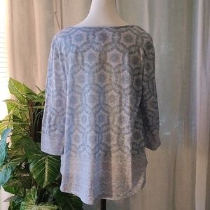 Lightweight 3/4 sleeve top by Ruby Rd, size L. Beautiful pattern with a keyhole neckline. Polyester/rayon blend, measurements in photos. Excellent pre-owned condition.