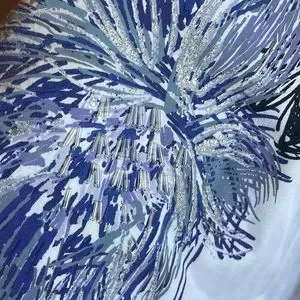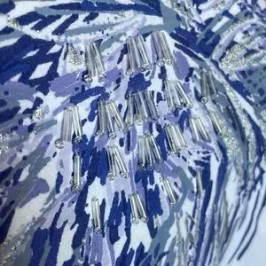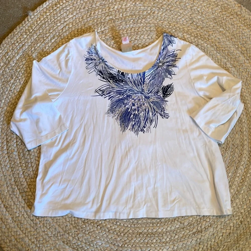 White top with blue palm graphic, some beadwork on palms. 3:4 sleeves. Size: 3x