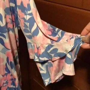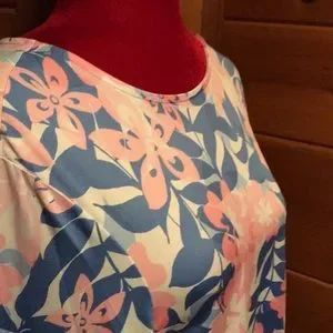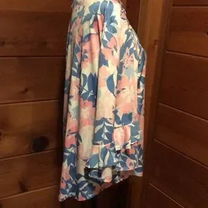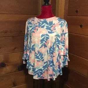 Pretty scoop neck, 3/4 ruffled sleeve and slightly longer in the back- this top is super cute and versatile!