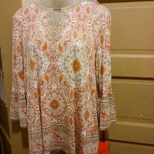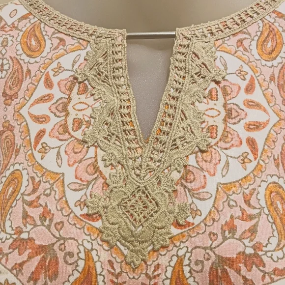 Ruby Rd. Make Me Blush: Soft long sleeve ruffle on end top. Peach/ Orange/ White/ Tan.