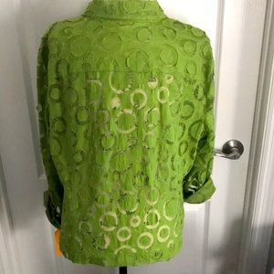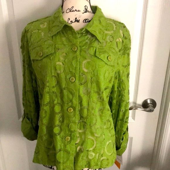 Ruby Rd. button-down, cutout top. Has versatile sleeves, that can be cuffed and buttoned up or worn down. Has a beautiful cut out design in lime green. NWT
