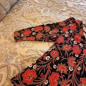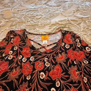 Charming floral design with vibrant red flowers. Perfect for stylish outings. Criss crossing detail at neckline. Lightweight with just the right amount of stretch for comfort. Loose fitting. 3/4 sleeves. Smiley hem.