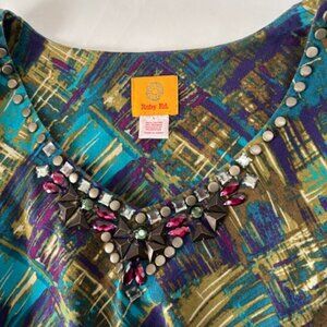 Ruby Rd Top V-Neck 3/4 Sleeve Womens Large L Green Abstract Embellished Neckline