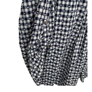 This Ruby Rd. women's blouse in size large is a chic button-up shirt in a navy blue and white plaid pattern. Made from comfortable cotton, it features convenient roll tab sleeves.