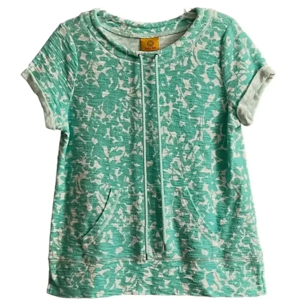 short-sleeve, casual top in a light teal color with a white abstract floral or leaf-like pattern. It features a rounded neckline, rolled-up sleeve cuffs, a front kangaroo pocket.