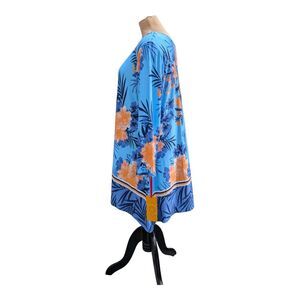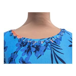 The Ruby Rd Tropical Floral Print Rayon Blouse in size XL is a vibrant and stylish addition to any woman's wardrobe. With its 3/4 sleeves, round neckline, and pullover closure, this blouse is perfect for both travel and casual occasions. The floral pattern in orange, blue, and purple colors adds a colorful and bohemian touch to the classic design. Made from a comfortable woven rayon fabric with a touch of spandex for stretch, this blouse is easy to care for with machine washable instructions. Perfect for all seasons, this blouse from Ruby Rd is a must-have for any fashion-forward woman.