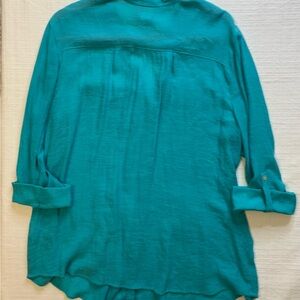 Chic turquoise button-down shirt. Features front pockets and rolled sleeves. Ideal for versatile styling.