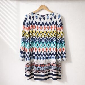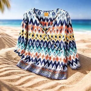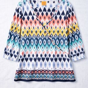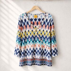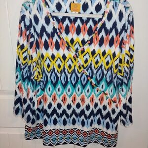Brighten your look with this colorful diamond pattern blouse. Features a mix of bold colors and a flattering fit.