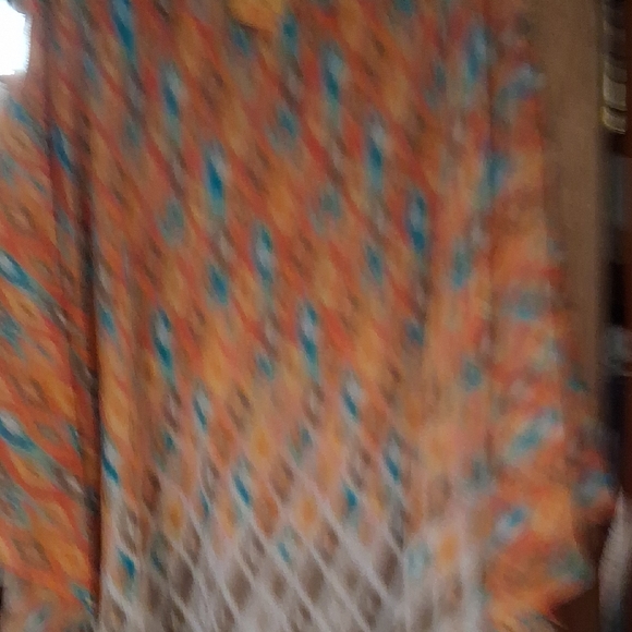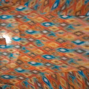 Ruby Rd Colorful blouse with a striking ikat design. Features orange, blue, and brown hues. length 28 inches