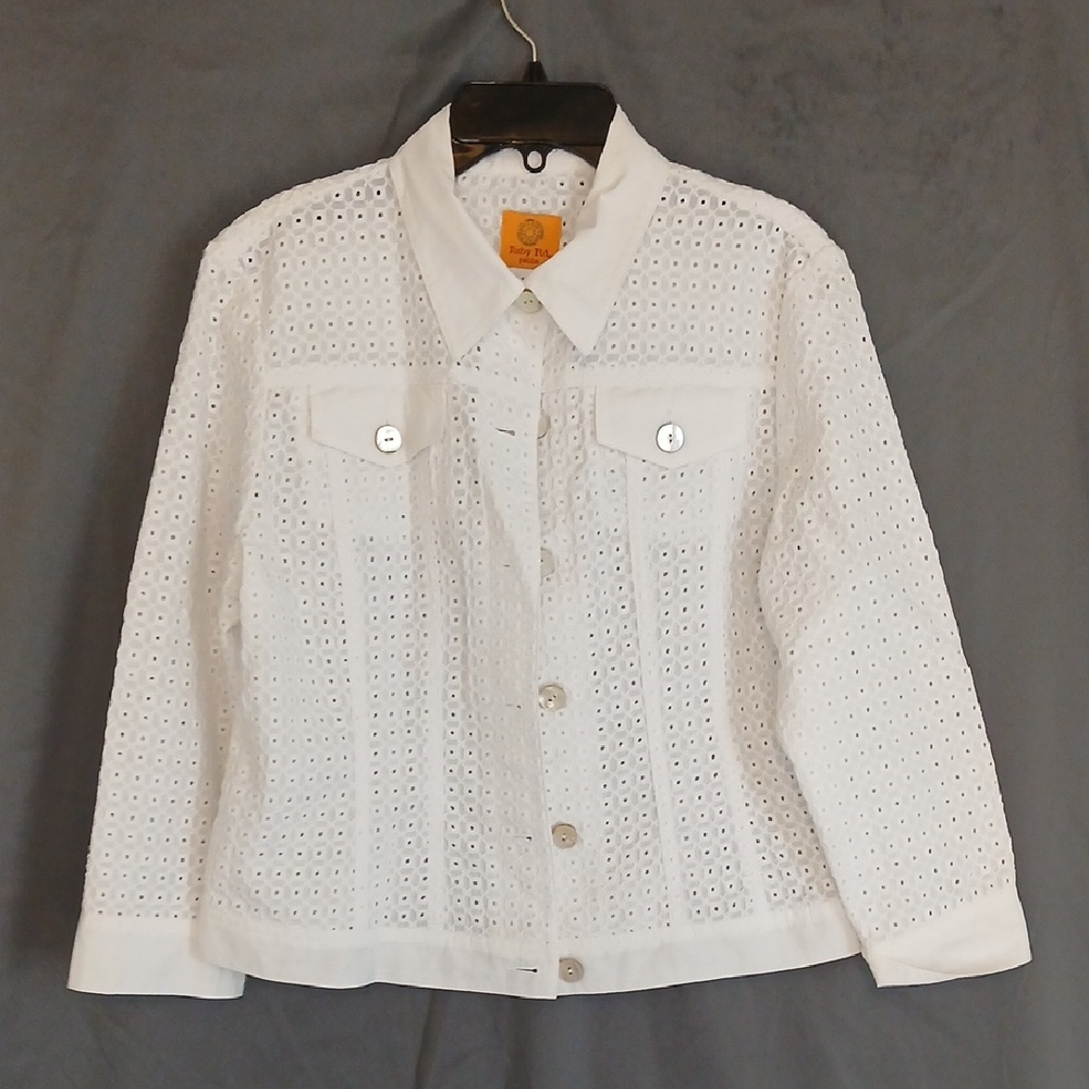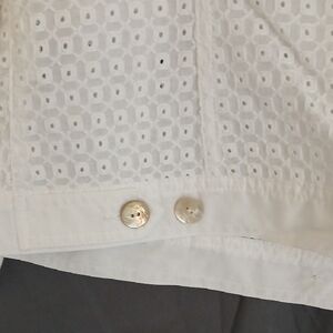 Chic white eyelet design. Button-up front. Stylish and versatile.