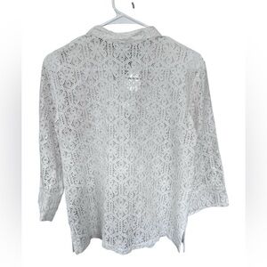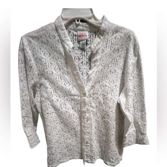 Ruby Rd. Favorites white lace blouse with button-up design. Ideal for versatile styling. 3/4 sleeve style tunic has pretty much no signs of wear. Pictures show very clean blouse.