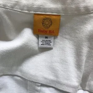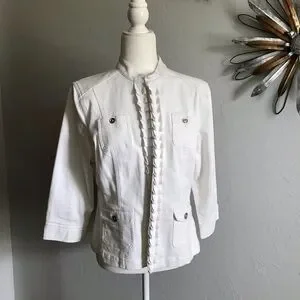 Elegant white jean blazer with ruffle trim. Features buttoned pockets, buttoned 3/4 sleeves, stand up collar with hook eye snap closure. Adorable like new condition. Perfect for layering. Pit to pit 21.5” / TY for stopping by my closet ❤️❤️