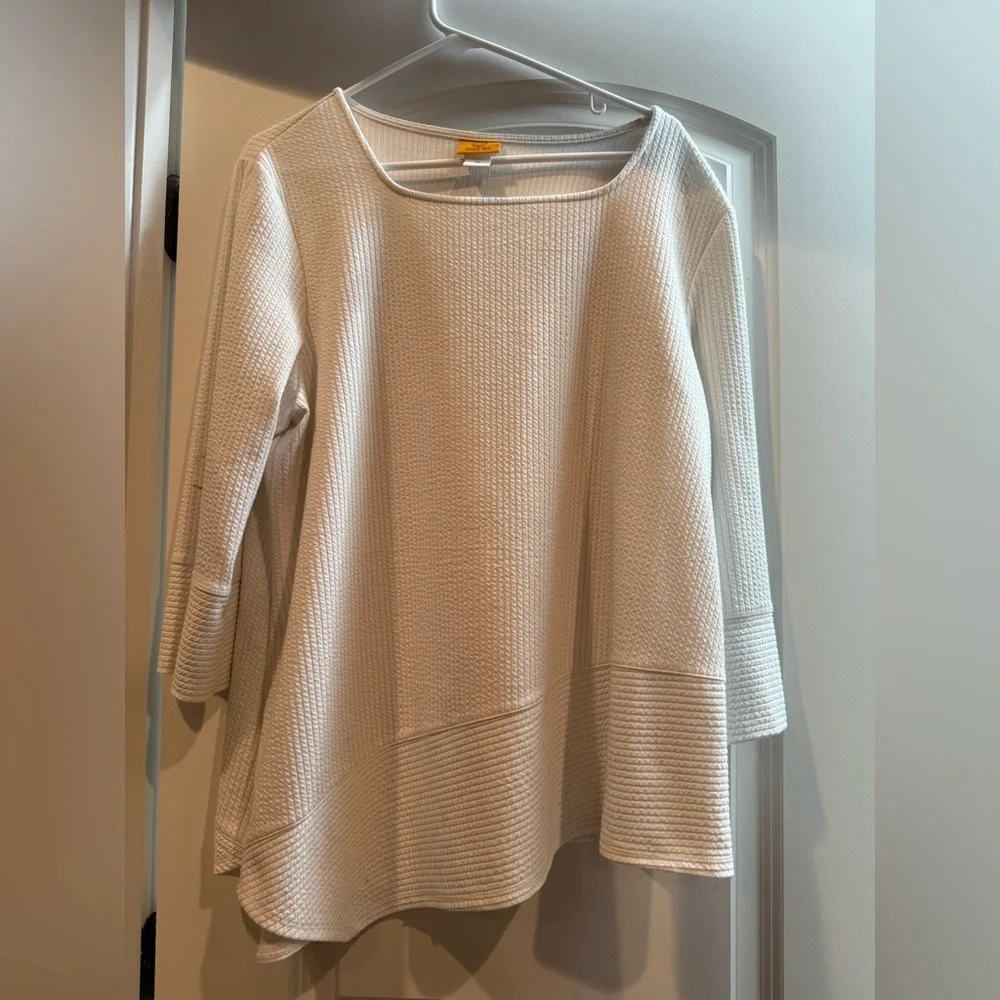 Chic white tunic with a textured pattern. Features three-quarter sleeves. Ideal for everyday style. Just noticed a couple of marks on the sleeve that will probably come out, but changed the listing price to refect.
