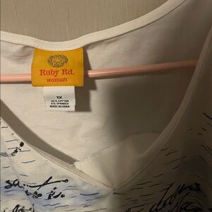 Elegant V-neck top with blue script on white fabric. Ideal for everyday style.
