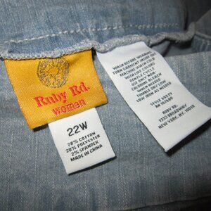 This listing is for a lovely pair of size 22W pull on cropped capri jeans from Ruby Rd. Woman that is new with tags. The jeans are from the group Key Items and are a light blue wash denim with lots of stretch.