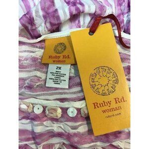A women's plus size 2X blouse from Ruby Rd Woman. The top is in pink and white with a stripe pattern. The blouse is lined, tunic style, scoop neckline, beaded, 3/4 length sleeves and stretch. The blouse is new with tags.