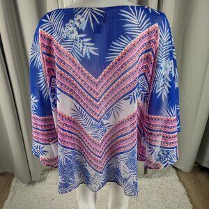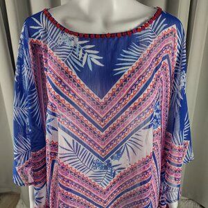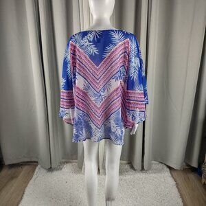 Ruby Rd Women's Blue, Pink, Tropical Chevon Chiffon Poncho Blouse, Top Size 2X