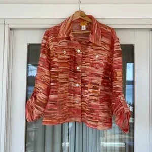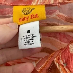 Like new stylish button-up lightweight top with vibrant apricot and cream pattern. Size 18. Sheer with shell buttons. Perfect for layering. Measures 24” pit to pit. Feel free to ask any questions.