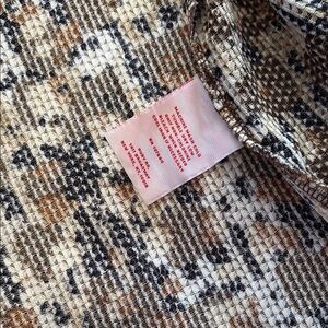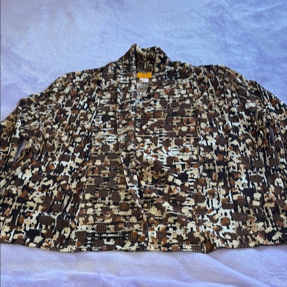 Stylish open-front jacket. Features a mix of brown, black, and cream patterns. Perfect for layering. #p590